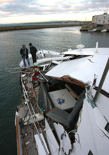 The Dignity with heavy damage after being shot at and rammed by an Israeli warship |