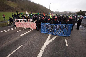In a memorial to the 1400+ Palestinians killed, around 300 black-clad protesters carried coffins and banners towards the factory. At the bottom of the road the protest split, with most of the crowd scrambling up the bank into the woods behind in an attempt to make it to the factory cross country. The rest remained at the bottom of the road, which was blocked off by lines of police vans, where they read the names of the victims of Israeli aggression. The back of EDO was surrounded, as mounted police, and dogs guarded the fence. With the police beating protesters with batons, some managed to get into the back of a nearby bakers through a wire fence, only to be met by more of the baton-brigade, causing a tactical withdrawal into the safety of the woods. The police weren’t risking any re-run of the Shut ITT demo in October 2008 (see
