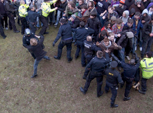 Halfway through the occupation activists attempted to rush the building and break through the lines of police – an action that resulted in batons being pulled out and things turning nasty – two arrests were made on suspicion of assaulting a police officer and both are still custody.
