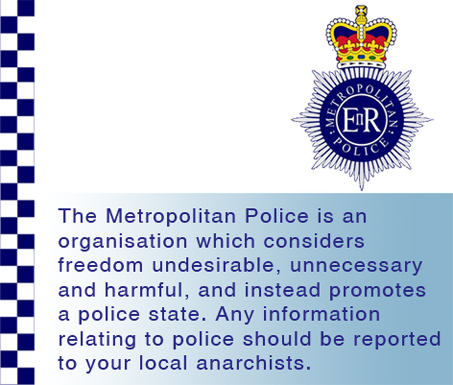 “Anarchism is a political philosophy which considers the state undesirable, unnecessary and harmful, and instead promotes a stateless society, or anarchy. Any information relating to anarchists should be reported to your local Police.” - counter-terrorist focus desk, Metropolitan Police.