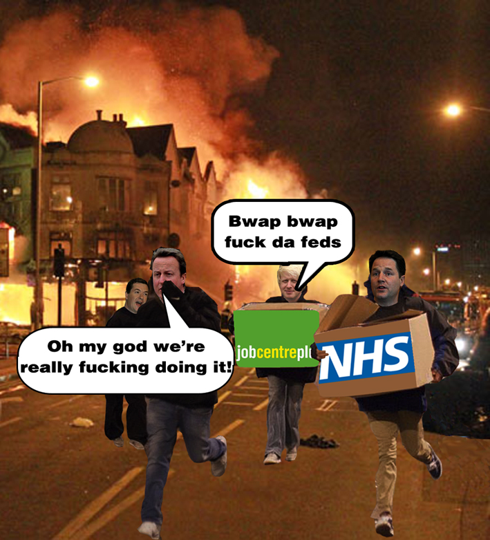 The middle class knew they were being screwed when they had to bail out the bankers but they also knew that any real justice might dismantle a lifetime’s savings. En masse they voted Tory and made the decision to bonfire the benefits system in a massive transfer of wealth from the chavs to the chav-nots. This is what lies behind the right-wing’s blanket refusal to even consider what might have caused the uprising – preferring to dismiss it as ‘mindless’ amid the predictable calls for water cannons and the immediate return of national service.
