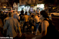 Rachel: The situation has inspired the creation of a small anti-fascist group, Antifa 972. They are acting to gather information on those organising the fascist attacks as well as taking direct action. At the next Tel Aviv demo members of the newly formed group formed a black block to protect those individuals targeted. After about a minute of this the police violently removed the peace demo from the square.