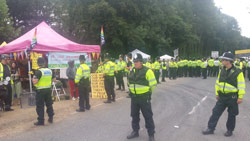 This victory means that the camp continues to be occupied by a number of die-hards but the police presence is substantially increased to enforce the on-going Section 14. SchNEWS reckons there are more police than protesters and the "set-pieces" still take place with every lorry arriving or leaving. Sometimes a few protesters engage in the now familiar slow march in front of each arrival and sometimes they just leave the police to do it for them.