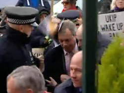 Twatted over the bonce with a placard and harried with cries of “animal abuser” and “racist scum” Nasty Nige eventually managed to barricade himself inside the hotel.