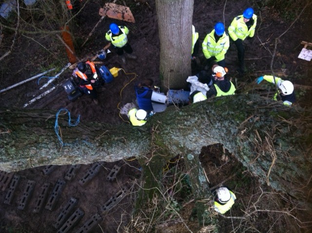 Approximately seventy bailiffs and security crossed the bridges, together with around twenty cops. They offered a get-out clause to those prepared to leave immediatley and then started to tackle those locked on at ground level. It was midday before the first protestor was unlocked and marched off. In fact it took them the rest of the day to clear the ground of the five lock ons and tunnels. It wasn't until 4.30 and twilight that the contractors were able to begin brush-cutting around the base of the trees.