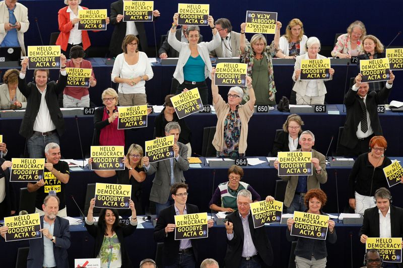 On Wednesday, ACTA, the anti-piracy agreement, was comprehensively defeated in the European Parliament with 478 votes against, 39 in favour, and 165 abstentions. In a symbolic gesture several members of the Green Party held banners reading: “Hello Democracy, Goodbye ACTA”.