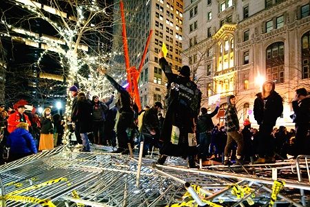 Occupy Wall Street didn't take time off from agitating to get messy on New Year's Eve, temporarily re-occupying Zuccotti Park - in what they called a New Year's Revolution - despite a massive riot cop turn-out. It was the biggest mobilisation of the group since their mid-November eviction (see SchNEWS 797). Unfortunately the cops didn't take any time off from being arseholes: After bringing out the batons, pepper spray and horses, 68 of the several hundred protesters had been nicked by the first morning of 2012 for offences ranging from trespass, disorderly conduct and one case of assaulting police.