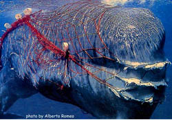 Drift-nets in the Med are intended to catch swordfish and tuna but research figures estimate that up to 100,000 cetaceans (dolphins and whales) and 100,000 sharks are also caught as unintended casualties of the fishing methods. Around 15% of the fish caught are the actual targets, leaving 85% of the catch unwanted, so they simply throw them dead over the edge into the deep. The most common victims are sperm whales ( in their hundreds), fin whales, (not so) common dolphins, striped dolphins (the biggest casualties of driftnet by-catch), blue sharks, thresher sharks, short fin mako sharks, basking sharks (sharkwise Moroccan trawlers are the largest culprit with an estimated by-catch of 60,000 and 90,000 per year- which makes the estimated overall figure of 100,000 sharks caught by drift-nets seem rather conservative), sea turtles (with an estimated 60,000 kills a year in the Med alone - critically endangered are the loggerhead, green, leatherback and hawksbill turtle), shark rays, skates and the devil fish are other frequent victims.