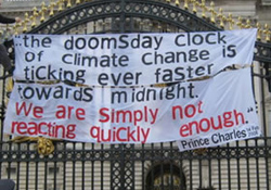 At 2pm on Saturday 4 people approached the gates of Buckingham Palace, climbed them and hung banners with slogans including a recent quote from Prince Charles. Surprisingly both SO14 (Royal Protection) and the Scots Guards on duty were more restrained than might be expected and no shots were fired. The small number of supporters present no doubt had something to do with the “are they or aren't they spies?” controversy. The four climbers were eventually arrested several hours later after a cherry-picker was brought to the scene. One of those arrested was Phil Thornhill the leader of the one man band that is the Campaign against Climate Change (CaCC), which is best known for its relentless organising (in the face of persistent institutional indifference) of an A to B marches through London every year to coincide with the UN climate talks. Whether the decade of being politely ignored by politicians has taken its toll and caused him to snap we have been unable to ascertain but one suspects he will find that Her Majesty can politely ignore people with the best of them.