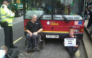 Traffic was brought to a standstill for over two hours outside the Houses of Parliament On Wednesday (20th), when two buses were blocked and occupied by accessible transport protesters.. The action happened spontaneously, on the premise of, as some of them put it “if you can't get on the bus, get in front of it”. Rosa Parks eat your heart out.
