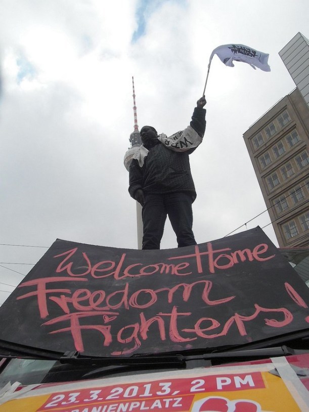 “Under the most extreme conditions – state repression and isolation, our own traumatic past, precarious financial conditions, the cold, lack of medical care, the lack of planning any safe and future-oriented everyday life, but also language barriers and many substantive differences amongst us – we build up ourselves again and again and confront us to the conditions in solidarity. We continue to gain strength and endurance – every day!” Refugee Revolution march, Berlin.