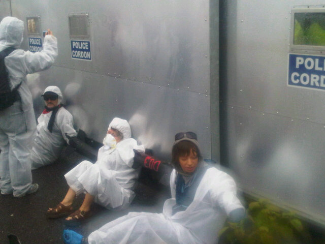 It was quite fitting that the police brought a barrier designed for use during chemical, biological and nuclear threats to a Weapons Inspection. Unfortunately it was facing the wrong way- the police had identified the 70 odd white-clad citizens' weapons inspection team as the clear and present danger, rather than the factory facilitating the proliferation of weapons of mass destruction.