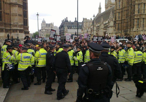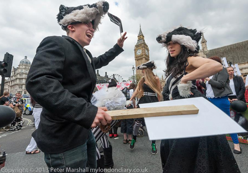 At around 3pm just as the cops seemed to be trying to create a corridor of vans to push the BNP along their march route re-inforcements arrived from the 'Stop the Cull' demo which had just ended in St James' Park. The sight of four or five hundred badger masked antis pouring across Parliament Square with a sound-system was enough of a wild card to temporarily halt any police plans. The animal rights crowd sowed further confusion by torching an effigy of Owen Paterson outside Parliament and dragging their soundsystem into the road for a bit of badger dancing.
