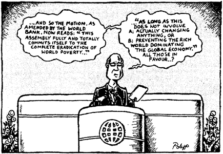 To those who asked "But what would you put in the place of the IMF and World Bank?", veteran campaigner and author Susan George replied "And what would you put in the place of cancer?" GLOBAL SOLIDARITY Around the world solidarity protests took place in 45 cities in over 20 countries. Unfortunately many police forces showed a high degree of solidarity with their Czech counterparts in administering excessive violence. ASIA: Israel, Tel Aviv over a thousand participants assembled for street theatre, art and other protest and then marched (very slowly) through the banking street. Delhi, India, around 60 people from various organisations successfully blockaded the entrance to World Bank offices for two hours. Calcutta, India, a rally of around 500 people was held under the banner 'Prague Solidarity 2000'. The lively event went on for seven hours and included speakers and discussions. A memorandum to the Indian Prime Minister was submitted urging the government to refuse to take on the destructive policies of the IMF and World Bank. Mumbai, India, activists staged a protest at the entrance to a new shopping centre calling for a halt to the increasing gentrification of the city and onslaught of multinational corportations. Members of the public gave the demonstration great support with some joining in. AUSTRALASIA: In Wellington, New Zealand over 200 people enjoyed free food and music before moving on to a protest outside Westpac Trust bank . The day was peaceful until the police moved in and made an arrest when scuffles broke out 12 more people were nicked. In Melbourne, Australia 2000 people marched in solidarity with the S26 protesters braving the grey, wet and cold Melbourne weather. In Sydney, Australia protesters attempted to blockade the Prime Ministers office and met with police! SOUTH AMERICA: Brazil : In Belo Horizonte over 200 assorted activists assembled at the Central plaza to begin a Carnival Against Capitalism. Armed with banners, leaflets, posters, puppets and music the lively procession made its way to the Citibank where a blockade was successfully maintained for an hour despite a heavy-handed police presence. In San Paulo, a group of Zapatista supporters held up a busy traffic intersection for an hour before moving off to join a rally of 500 at the Stock Exchange. Meanwhile in Brasilia, a determined group of 10 students held a demonstration at the Central Bank of Brazil, distributing leaflets and displaying banners. In Fortaleza, 200 marched along to McDonald's to protest at the takeover of local culture by multinationals and distribute free ethnic food. NORTH AMERICA: Berkeley, California: 500 people held a critical mass bike ride and Street Party. In Burlington, Vermont demonstrators held a march which ended at the new GAP store (known for their use of sweatshop labour) and through a variety of actions managed to halt business for a short while. In Denver a procession made it's way through the shopping centre targeting Starbucks, Gap, and Nike Town and then made its way to the office of Vice President Al Gore's office to protest against the plight of U'wa Indians in Columbia. In Massachusetts over 300 demonstrators descended on supermarket corporate giants WalMart. In Hartford 400 anti-globalization protesters blocked a downtown street for nearly 4 hours during rush hour, before 20 of them were arrested. In Gainesville a group of about 50 people held an energetic march through the town centre. In Chicago hundreds gathered in the corporate crime centre, 8 people were arrested for wearing masks. In Montreal, Canada over 100 protesters carried out a march that ended at the Stock Exchange, riot police were at the ready but the march passed off peacefully. EUROPE: Bristol, UK: activists hung banners around the city informing people of alternative media links. In London No Borders protested at Waterloo Station highlighting the lack of free movement for refugees which is in sharp contrast to the increasing free movement of money. Under the slogan 'Money moves - why can't people?' demonstrators hung banners and distributed the Financial Crimes spoof newspaper. In Geneva, Switzerland about 50 activists helped to build a sculpture of flesh, bones and money outside the IMF offices. Barcelona, Spain: a demonstration was held on the 23rd, 4000 people marched to the sea past various banks and stock exchanges which got nicely decorated. At the end of the day 5 coaches set off for Prague. Despite the city authorities banning demonstrations on the eve of the 26th, about 40 protesters in Moscow went ahead and held a demonstration outside the World Bank offices anyway, six people were arrested so the demonstration moved to the police station where the arrestees were being held. In Utrecht, Holland 500 people marched through the town centre stopping at banks, demanding that employees take responsibility and think of the social and ecological consequences of the banks' investments. Malm, Sweden protests were held outside several bank offices around the town square. In Stockholm, Sweden around 200 people marched through the town on the evening of the 26th the evening passed off peacefully until riot police stopped the demo. As these reports show, resistance to destructive IMF/World Bank policies is not confined to middle-class European students as the mainstream media would often have us believe. All over the world, citizens of affected countries have been standing up and protesting about their situations. Here's your quick guide to just some of the global resistance mounted by developing countries in the past couple of years. In Argentina, people angered at IMF dictated government reform of labour laws, staged a wave of general strikes in '99. In May this year cuts to social security were met with lively demonstrations resulting in public offices being set ablaze. In Bolivia the privatisation of water thanks to the IMF led to a 35% price hike. As a result of demos the country was placed under a