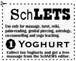 Inside SchNEWS * Jeffrey Luers (aka Free) sentenced to an outrageous 22 years for setting fire to several jeeps in a car lot (SchNEWS 308/309) recently received a 42-day sentence in solitary after being attacked by two other inmates. While in solitary he can only receive letters, so get scribbling. Jeffrey Luers #13797671, TRCI, 82911 Beach Access Rd, Umatilla, OR. 97882, USA * In a desperate attempt to get SchNEWS free Sean (first ever Inside SchNEWS prisoner) is in jail again. This time for violent disorder at Mayday 2000. Write to Sean - FR8832, HMP Wandsworth, P.O.Box 757, Heathfield Road, London, SW18 3HS. * Mark Barnsley has been moved yet again. From Wakefield Prison to HMP Leeds segregation unit for refusing to do prison work for private companies (SchNEWS 317). Mark Barnsley WA 2897, HMP Leeds, 2 Gloucester Terrace, Armley, Leeds, LS12 2TJ * Mark Cullinane has been in a Moroccan jail for 5 years for smuggling cannabis. If 2,000 can be raised before the end of the year Mark will be released a year early and rejoin his family. Benefit gig 5th November at the Concorde2, Brighton. Donations are welcome http://potwow.20m.com Write to: Mark Cullinane 21486,Chambre 7, Cartier C, Prison Civil, Tangiers, Morocco. Witnesses Needed: 20th May Hackney Town Hall was stormed by 50 angry residents protesting about council cuts (SchNEWS 306). Stephen Doyle (a drummer with Rhythms of Resistance who were outside the hall) was assaulted, sprayed with CS gas and arrested by police. He now faces a charge of threatening and assaulting a cop. And May Day this year, Nick Gray was arrested on the Critical Mass bike ride for wearing a baseball cap and sunglasses about 2pm on Malton Street, Euston. Witnesses for either case contact Andy Katzen at Moss & Co solicitors 020-8986-8336, andrew@mosslaw.co.uk Pool The Other One We've received more info about the Govanhill swimming pool protest (SchNEWS 317). We've received reports of how a woman was taken to hospital with a suspected broken leg and an 11 year old boy was kicked by the police. Another woman was beaten up by police in a lane. When she made a formal complaint the police visited her at 3 in the morning in a blatant show of intimidation. Police on the demo were racist, calling Asians "black bastards" and four officers beat an Asian man unconscious who was running away from a police horse charge. A daytime picket outside the swimming pool continues along with a police presence. More info: 07000 752752 www.saveourpool.co.uk ...and finally... | ||