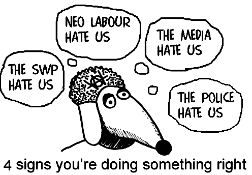 * The Foreign Office culture of turning a blind eye to unpleasant, but useful, regimes is of course not restricted to Uzbekistan. The annual Foreign Office report on human rights was widely expected to reflect the frustration in Europe with Russias unwillingness to curb gross abuses by its military as the war in Chechnya enters its 5th year. Last years report had already warned that these abuses could bolster support for extremists. However, in the wake of the Beslan school massacre, Jack Straw has suddenly delayed publication, apparently to allow Russia to focus on its grief and sense of loss and to condemn totally the terrorists responsible. Internal leaks, however, indicate he felt the report was too critical of trigger-happy president Vladimir Putin. More Flinging!!The SWP are obsessed with the unions, waiting for their big battalions to stir into action. But at SchNEWS own conference, speaker after speaker pointed out that if we are to win the fight against capitalism, then we wont get anywhere by asking nicely. This really isnt rocket science yet as Anne Jones talked movingly of the death of her son, she said it was his friends, not the unions who had taken direct action to try and get justice for her son and better working conditions for others. One person asked Whats the point of fighting organisations that cant fight? Take the Transport and General Workers Union who cancelled last Fridays demo in support of cleaners after Canary Wharf Group took legal action to stop the demonstration. The cleaners - mainly women of African and South American origin - clean the desks and empty the bins of some of the richest bankers in the world for little more than £5 an hour, minimum holidays and zero pensions. One key demand from the unions is that employers greet the cleaners with a hello and a smile in the early morning. Now thats real fighting talk! Positive SchNEWSMega rich football stars dont often appear on the pages of