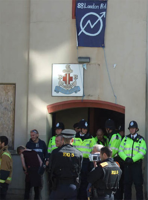 Brighton’s squatted social centre, the 88 London Road squat, has defied its last court order as police and bailiffs busted through the fortified doors early yesterday morning (3rd July). Occupiers of the abandoned Methodist church had already resisted one eviction attempt on 12th June (SchNEWS 632). They had been holding a regular ‘free kaff’ on the bustling street outside and had just began reopening its doors for a variety of events. There was, however, the constant realisation that the space was likely to be evicted at any moment.