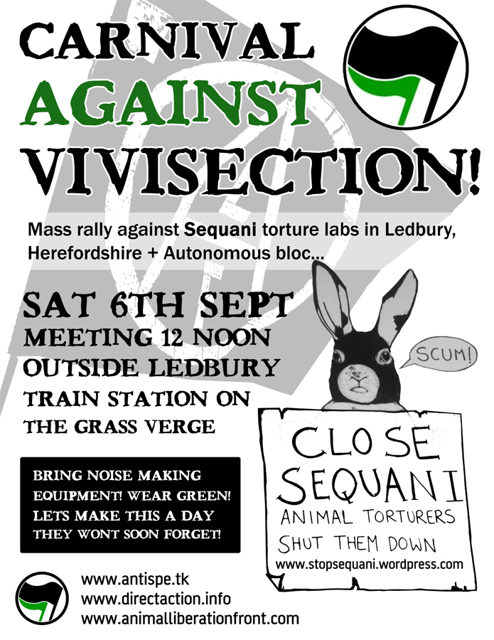 Make your stand against the vivisection industry and animal abusers at Sequani Labs. This protest is in solidarity with Sean Kirtley who was imprisoned by the state for supposedly organising protests against Sequani (See SchNEWS 634). Even though he has never broken the law himself at Sequani (and the police agree) he was sent to prison under new SOCPA legislation which shatters the right to organise and protest.