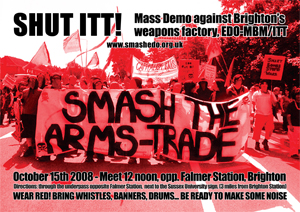 Since 2001 over a million people have been killed worldwide by the US-UK War of Terror. EDO MBM/ITT supply weapons components for the US-UK war machine. Smash EDO has been campaigning for four and a half years to close down EDO. Our movement is growing, in June this year over 600 people came from around the country to the ‘Carnival Against the Arms Trade’. The Carnival managed to reach the Brighton bomb factory despite police attempts to stop us! This time we expect a show of force from the police. We will not let them stop us showing our anger at EDO MBM’s complicity in war crimes...
