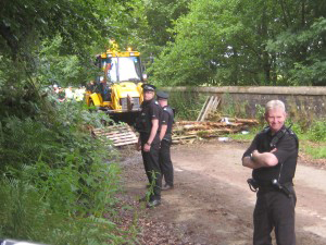 Early last Tuesday (7th) protesters at the Mainshill Solidarity Camp in South Lanarkshire were rudely awoken by police barging a JCB digger into the barricaded entrance to the site. Following at their heels were representatives of both Scottish Coal and drilling company Apex, who rolled flat bed trucks into the site to remove their equipment, including two drilling rigs, a dump truck and two portacabins. The equipment had spent three weeks impounded in the camp, preventing exploratory drilling which has now recommenced at a different location.