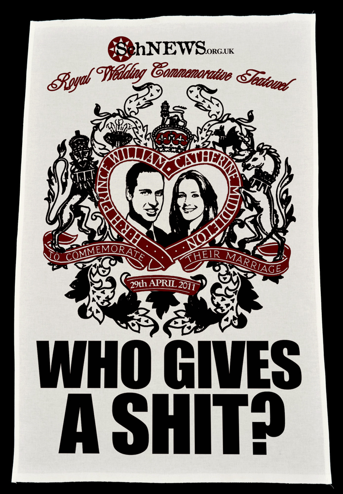 Some people are cashing in on the royal wedding with gratuitous, opportunistic, unofficial merchandise. Er - including SchNEWS... Re-live the magic of Wills and Kate's special day everytime you wash up your greasy plates with this special edition teatowel produced by SchNEWS. Sure to be a prized collector's item after these parasites have all been beheaded in a bloody revolution.