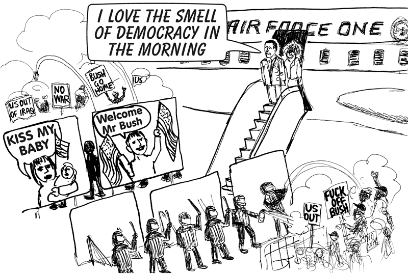 is officially SchNEWS's last graphic about W. Good riddance to him.