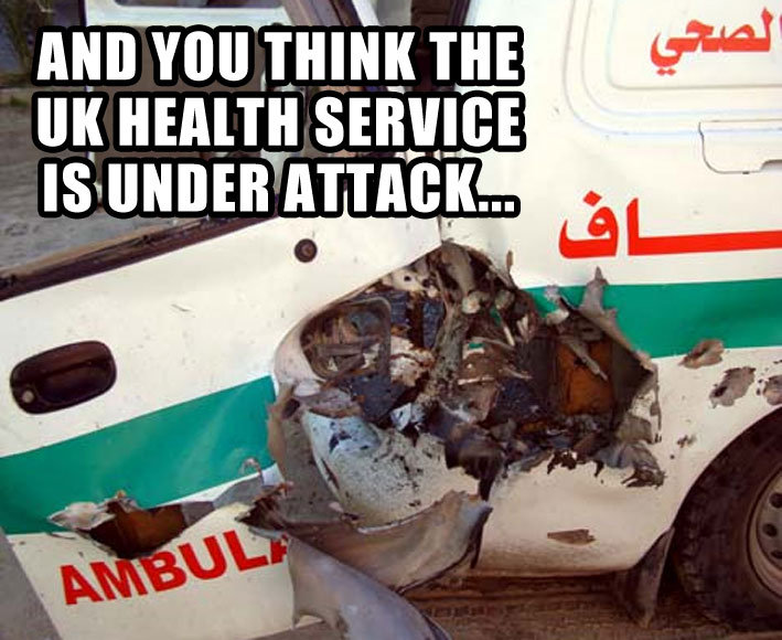 the wreckage of ambulances destroyed by Israeli fire.