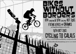 On a more practical note there's been an urgent call out for bikes, trailers and useful tat such as tents, sleeping bags and tarpaulin for people in Calais as the winter approaches. A bike train will be going from Brighton Weds 10th Oct. The plan is to collect as much useful tat and bikes as possible and take them over to Calais. Meet Monday 8th Oct & Tuesday 9th Oct to fix up bikes @ Cranks, 22 Chapel St, Brighton, BN2 1RQ. (http://cranks.org.uk) or email bikeswithoutborders@riseup.net for more details or if you have stuff or money you can donate for this project (even if you can't come yourself) or need a crash space in Brighton before we go.