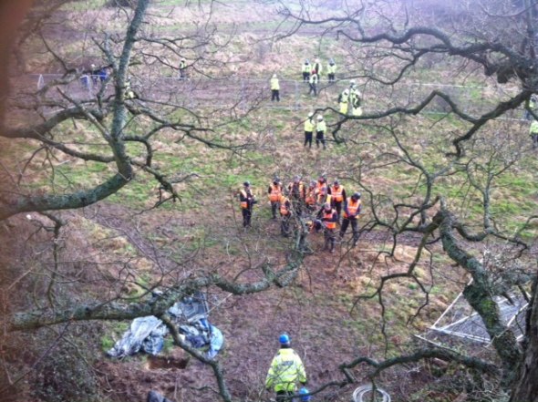 Approximately seventy bailiffs and security crossed the bridges, together with around twenty cops. They offered a get-out clause to those prepared to leave immediatley and then started to tackle those locked on at ground level. It was midday before the first protestor was unlocked and marched off. In fact it took them the rest of the day to clear the ground of the five lock ons and tunnels. It wasn't until 4.30 and twilight that the contractors were able to begin brush-cutting around the base of the trees.