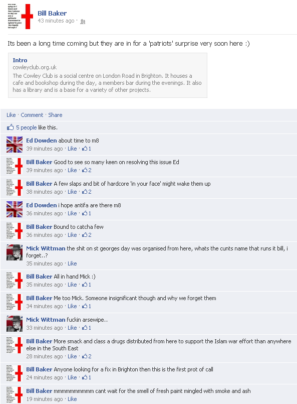 On Friday 7th September, undeterred by these pathetic failures, Bill Baker (leader of lunatic fringe English Nationalist Alliance) took to Facebook to announce a “surprise” visit to the Cowley Club. Billy adds that he's going to give antifa “a few slaps” and also implies a bit of arson for good measure. In the meantime Bill has his best brains looking in to who runs the “collectively owned and run” social club. Our money's on this guy - http://en.wikipedia.org/wiki/Harry_Cowley