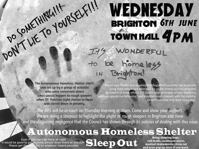 Brighton's squatted Autonomous Homeless Shelter organised a Mass Sleep Out action outside Brighton Town Hall. The following day representatives from the AHS attended a court hearing in Brighton magistrates where they lost possession of the property.