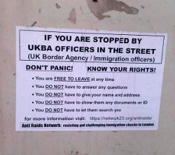 Successful disruptions of raids have taken place at locations such as a restaurants and shopping centres in one of the UKBA's favourite harassment spots, Elephant and Castle, among others. Activists manage to screw up the pigs plans by reminding them of their own guidelines: ID demands can't be made without a reason. To counter-act the cops' intimidation tactics, rowdy activists remind people that they are not obliged to give documents or speak to officers at all. Filming arrests and taking lapel numbers is another tactic for documenting the illegality of the raids.