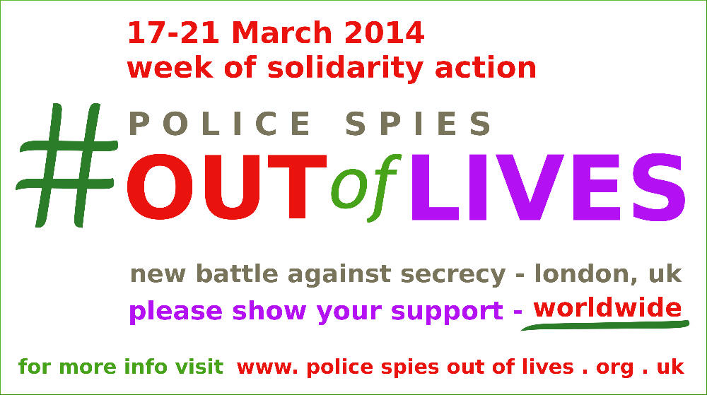 Police Spies Out of Lives are encouraging supporters to take part in a week of solidarity 17th-21st March, including a picket outside the Royal Court of Justice at 9am, Tuesday 18th March.