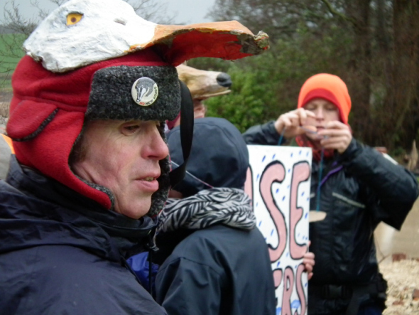 Clad in animal masks and wielding umbrellas – the amateur druids made straight for the roadworks and set about their ceremony. Whilst Schnews has been unable to ascertain whether any rain gods were listening to these prayers, there were certainly some security guards who had to be paid to hang around and it all made for some lovely photos.