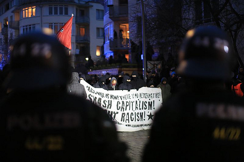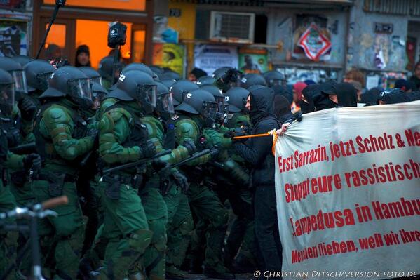 A demonstration had been called for the 21st of December “in solidarity with the Rote Flora squat, the Esso houses initiative, and for refugees’ right to stay." Last week the Esso social houses, home to a hundred people in Hamburg's district of St. Pauli, had already been evicted as part of Hamburg's rapid process of gentrification. The demo also highlighted the ongoing struggles for refugees in the city of Hamburg. Since the winter of 2012, more than three hundred African refugees have arrived in the city. They managed to escape from the conflict of the Libyan Revolution, made their way through Italy and eventually reached the German border. Hamburg was the epicentre on Saturday for defending social housing and refugees rights across Germany but demonstrations occurred in many other cities across the country.
