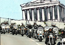 Around 9pm the easy riders crossed paths with far-right members of Golden Dawn in the Athens neighbourhood of Agios Pantalaimonos. Unsurprisingly a heated political debate ensued with two fascists requiring hospital treatment as their oratory skills were found lacking. The Greek mainstream media reports residents being present during the incident and one local producing a gun but not using it. Afterwards the anti-fascist motor division was followed and ambushed by Greek police motorcycle units.