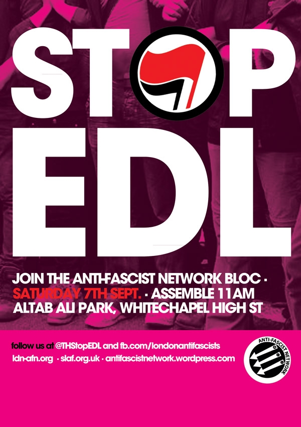 “EDL have today announced plans to march to Altab Ali Park for a rally on 7th September! This is a clearly an arrogant and incendiary declaration even on their own (sub) standards. We call on every militant anti-fascist to join us on the streets on Saturday with the good people of Tower Hamlets in ensuring that the EDL DO NOT SET FOOT in the area and are effectively opposed!” - London Anti-Fascists