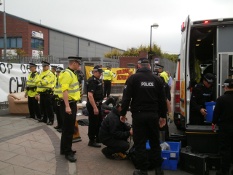 Protesters from Unity and No Borders gave the UKBA a taste of their own medicine on Tuesday (29th) with an unwanted early morning visit at Glasgow's Brand Street reporting centre. Three people blockaded the gates of the centre by locking on to each other through concrete tubing while supporters looked on.