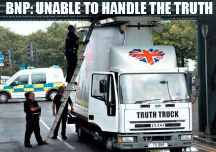 Now SchNEWs isn't normally a cheerleader for traffic accidents but on this occasion we had to make an exception. Perhaps hampered by the need to steer ever further to the right the BNP crashed their 'Truth Truck' into a low bridge in Sunderland on Monday.